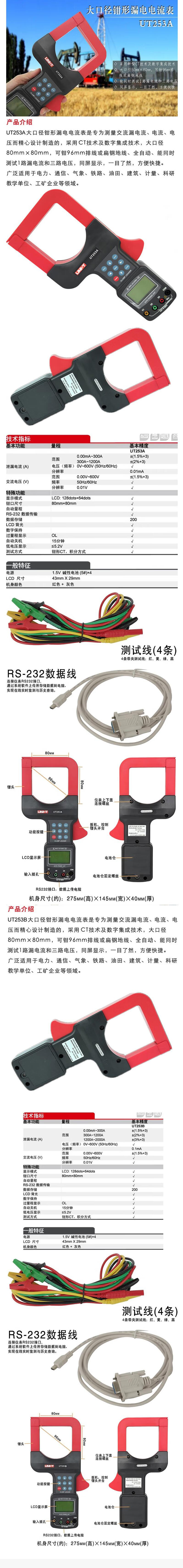 UT253系列大口径钳形漏电电流表是专为测量交流漏电流、电流、而精心设计制造的,采用最新CT技术及数字集成技术,大口径80mm×80mm,可钳96mm排线或扁钢地线、漏电流及负载电流检测。