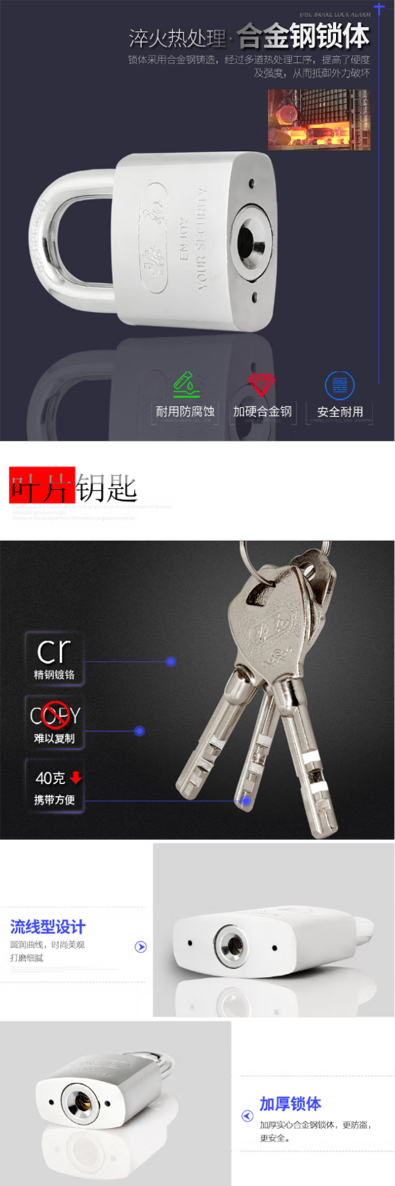 加厚实心合金钢锁体,更防盗,更安全。